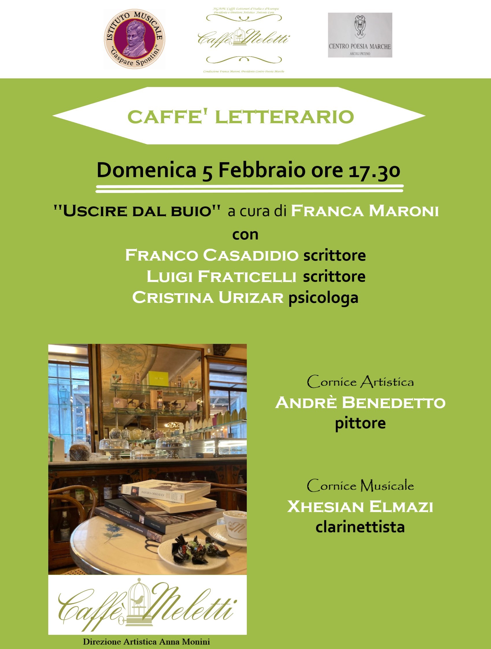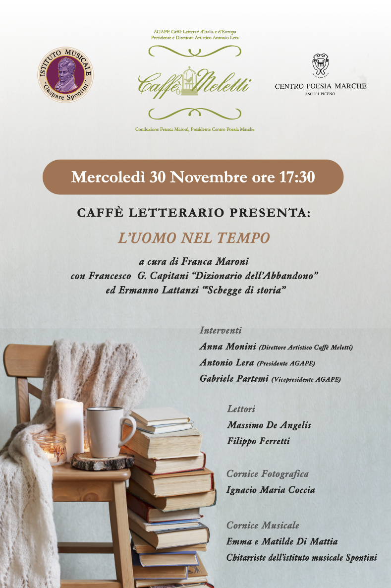 Venerdì 20 Ottobre ore 17:30 POETICHE ARMONIE (A cura di Franca Maroni) con "Arcani pensieri" di ENRICA LOGGI e ANTONELLA RONCAROLO interviene ANTONIO LERA (Presidente AGAPE, Caffè Letterari d'Italia e d'Europa) Cornice Artistica "La pittura di EDOARDO VECCHIOLA Cornice Musicale "Duo di clarinetti M° ALBERTO ALBANESI e PAOLO CESARONI Direzione Artistica ANNA MONINI