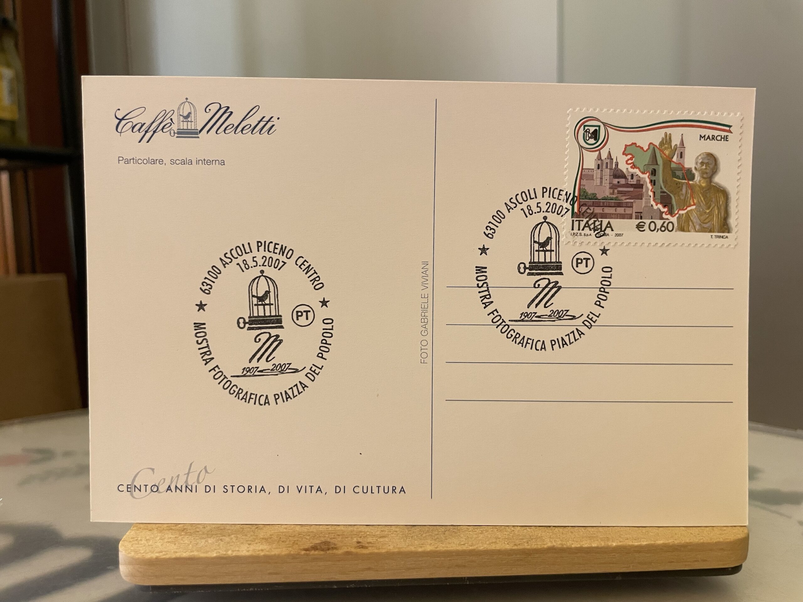 Cartolina storica dei 100 anni di attività del Caffè Meletti con francobollo e timbro